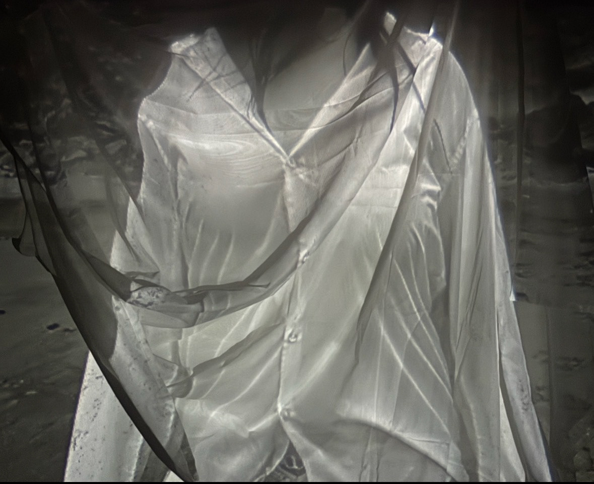Through monochrome prints, fabric, and projection, the installation creates a soft, immersive environment. Draped materials partially obscure the image, echoing the fragility of memory and the persistence of experience.